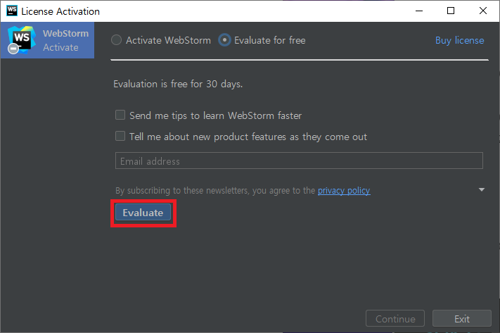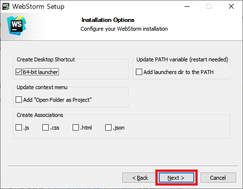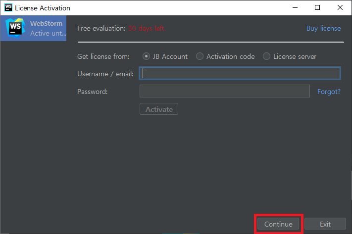 - 위와 같이 이전에 설치된 웹스톰이 있으면 그 설정을 유지할 수 있다. 처음 설치하는 경우에는 두번째 선택사항 선택.