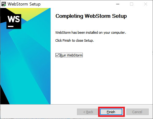 - 설치 완료. 초기 세팅을 하기 위해 Run WebStorm 체크하고 Finish 클릭.