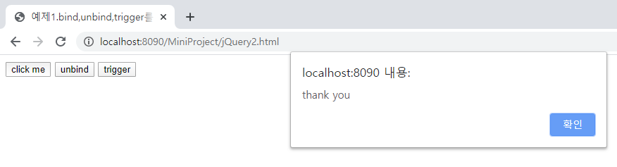 - 예제1. bind, unbind, trigger를 이용한 이벤트의 설치, 제거, 호출